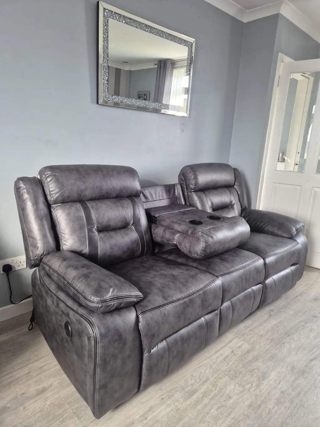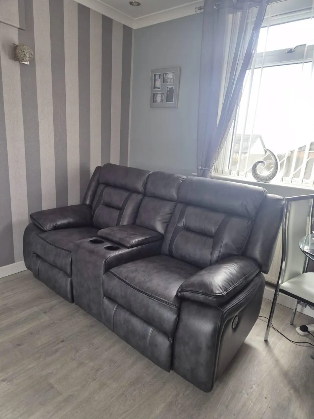 Enhance your living space with this recliner sofa, perfect for those who enjoy comfort and style. The sofa comes in a stylish Dark grey leather features a Electric recliner with a cup holder console. The brand ensures durability and long-lasting quality with a sturdy grey frame that measures