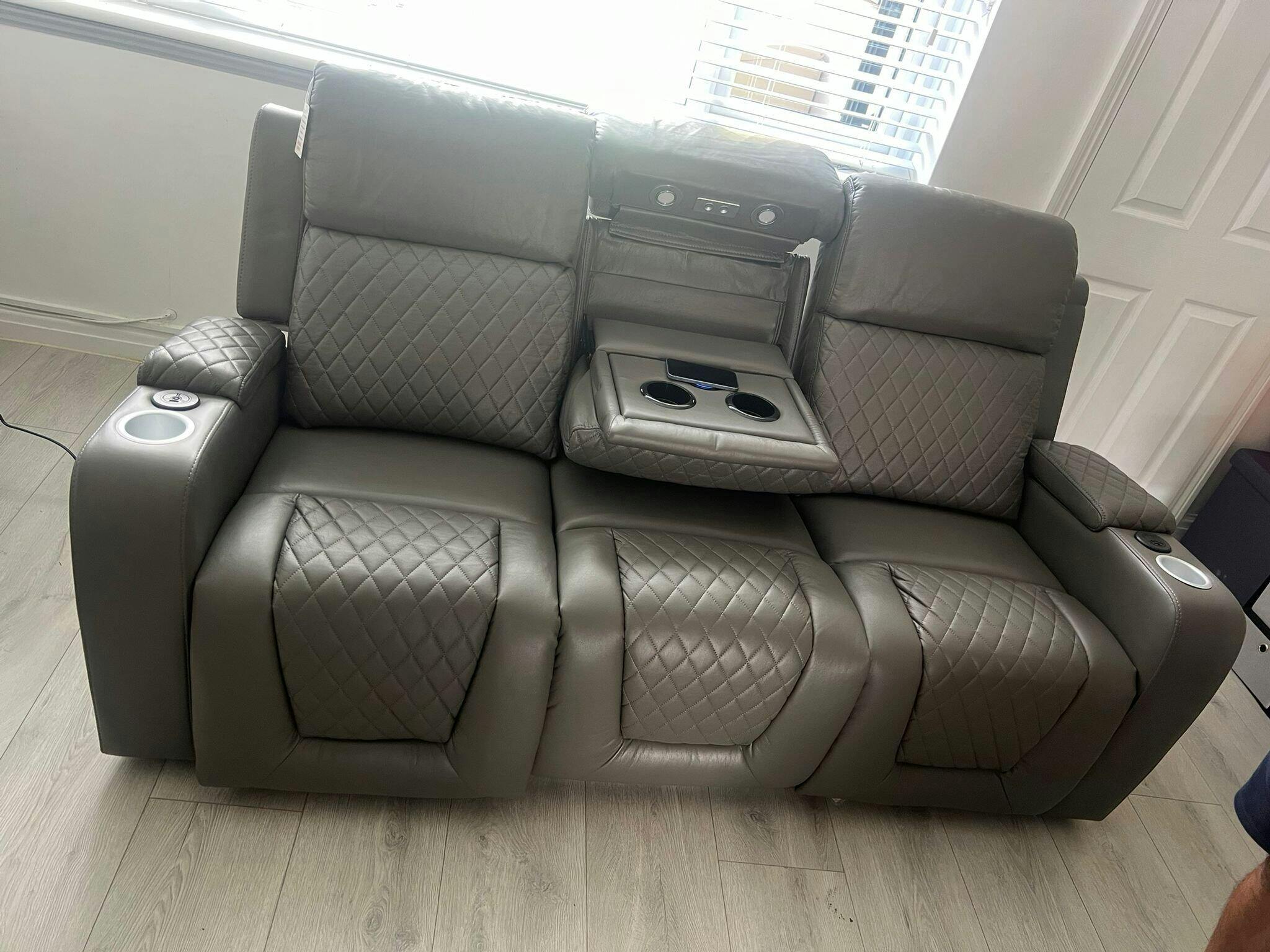 Upgrade your living room with the stylish and modern Florida 3+2 Electric Recliner Sofa Set in Black & grey upholstery. The medium firm foam fill material ensures comfort while the reclining back style, cup holders, and USB port features add convenience.